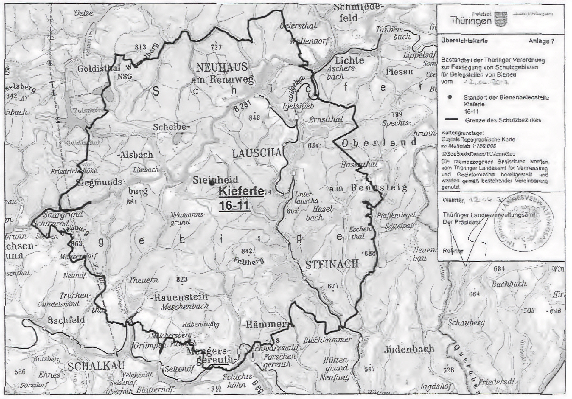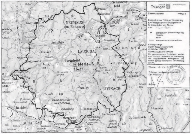 Wollen Sie in deren Umkreisen (7 Kilometer) Bienenvölker aufstellen, bedarf es einer Genehmigung. Durch den Schutzbereich sollen unerwünschte Kreuzungen oder der Eintrag von Krankheiten vermieden werden. Innerhalb dieser Schutzbezirke ist es verboten, dauerhaft Bienenvölker zu halten, die der festgelegten Zuchtherkunft der Bienenbelegstelle nicht entsprechen. Die Genehmigung zum Aufstellen von Bienenvölkern in Schutzbezirken von Bienenbelegstellen muss beim TLLLR (Thüringer Landesamt für Landwirtschaft und Ländlichen Raum) beantragt werden.