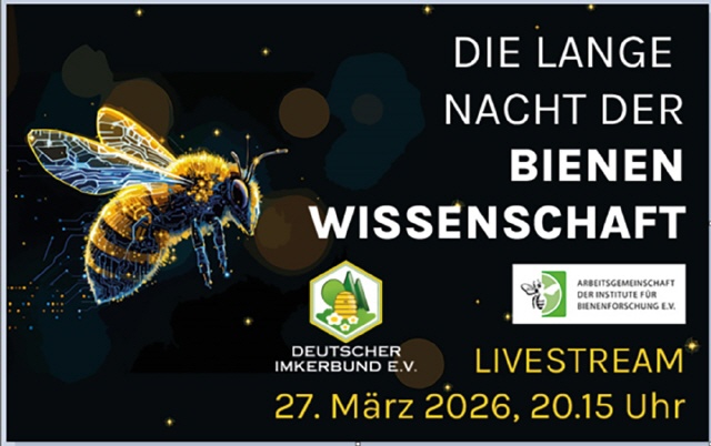 Wissenschaft spannend, kurzweilig und digital präsentiert: Wie in den vergangenen Jahren präsentiert der D.I.B. am 27. März 2026, ab 20:15 Uhr (MEZ), sein erfolgreiches Format „Die lange Nacht der Bienenwissenschaft“ (DLNDB) – in Zusammenarbeit mit der Arbeitsgemeinschaft der Institute für Bienenforschung e. V. Los geht’s um 20:15 Uhr (MEZ) mit dem DLNDB-Livestream – abrufbar über die D.I.B.-Homepage |